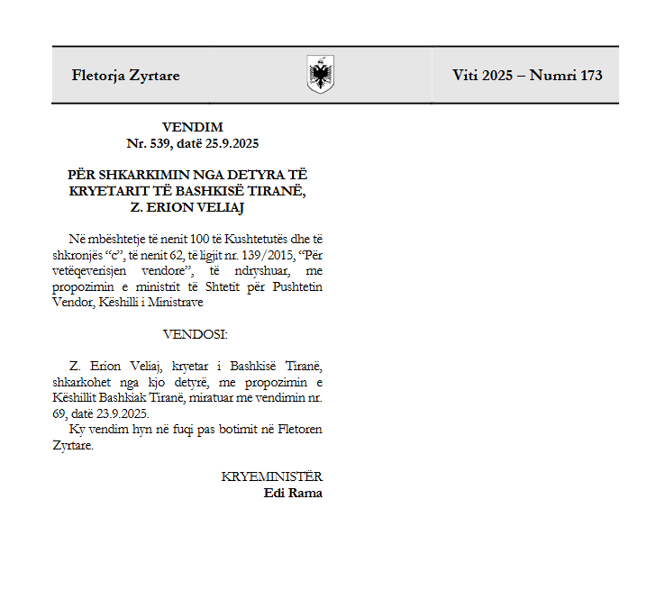 Është botuar sot në Fletoren Zyrtare vendimi për shkarkimin e Erion Veliajt nga detyra e kryetarit të Bashkisë së Tiranës.