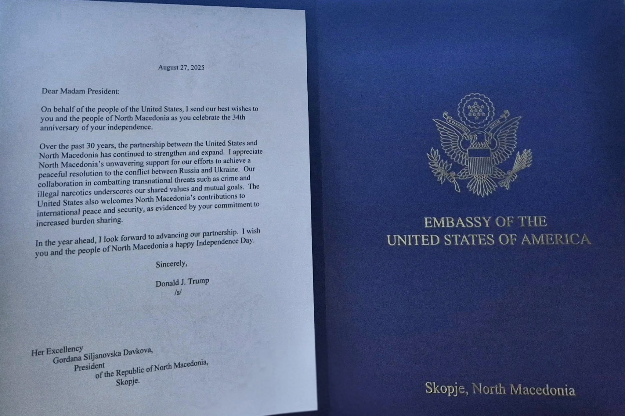 Presidentja e Maqedonisë së Veriut, Gordana Siljanovska Davkova, përmes një postimi në Facebook ka bërë të ditur se ka pranuar një urim nga presidenti i SHBA-së, Donald Trump, me rastin e 34-vjetorit të pavarësisë së vendit – 8 Shtatorit, përcjell TV21.