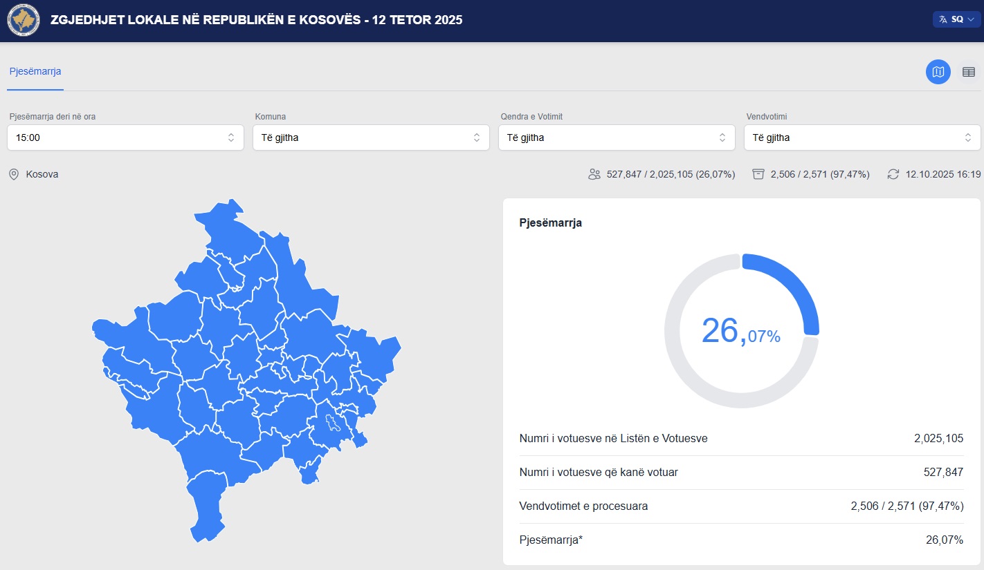 Komisioni Qendror i Zgjedhjeve ka përditësuar të dhënat e fundit për pjesëmarrjen në votime në zgjedhjet që po mbahen sot, në 38 komuna për kryetarë komunash dhe asamblistë.