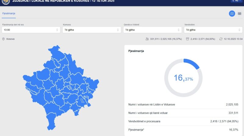 Komisioni Qendror i Zgjedhjeve (KQZ) ka publikuar të dhënat e fundit mbi pjesëmarrjen në votime në zgjedhjet lokale që po mbahen sot në 38 komuna të Kosovës, ku qytetarët po votojnë për kryetarë dhe anëtarë të kuvendeve komunale.