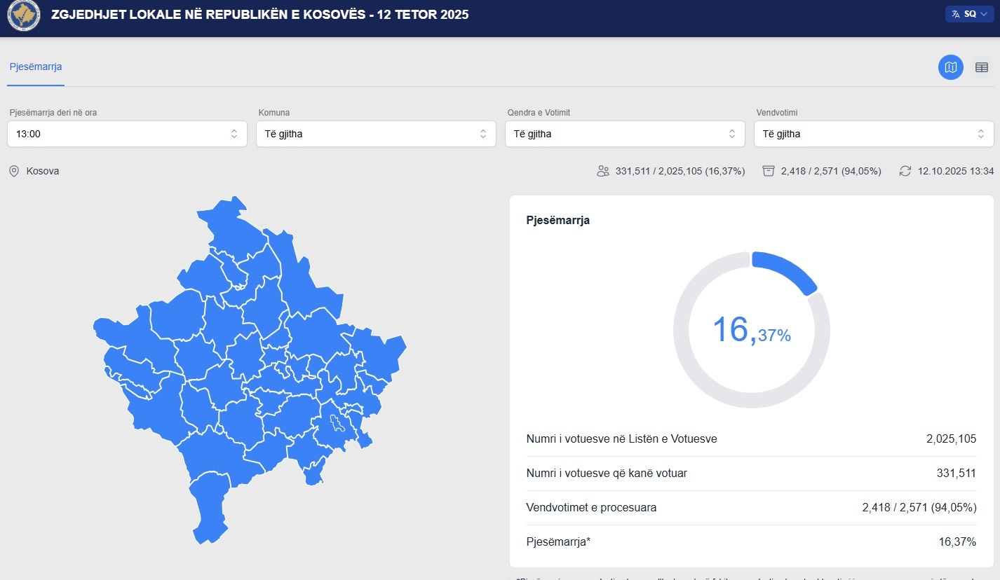Sipas KQZ-së, deri në orën 13:00, të drejtën e votës e kanë shfrytëzuar gjithsej 304,358 qytetarë, që përfaqëson 15.05% të trupës zgjedhore në shkallë vendil