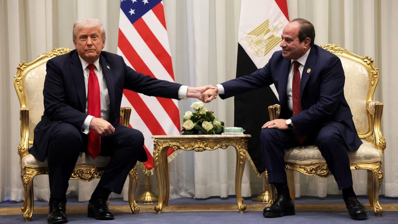 Presidenti i SHBA-së, Donald Trump, dhe Presidenti i Egjiptit, Abdel Fattah el-Sisi, folën shkurt me shtypin pasi Trump mbërriti në qytetin egjiptian të Sharm El Sheikh për një samit paqeje me dhjetëra udhëheqës globalë.