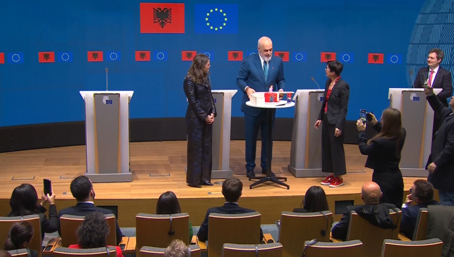 Komisionerja Marta Kos, në fund të konferencës për shtyp në Bruksel, bëri dhuratë një tortë me flamurin e Shqipërisë dhe me numrin 6 që simbolizon hapjen e të gjithë grupkapitujve të negociatave.