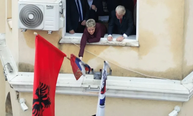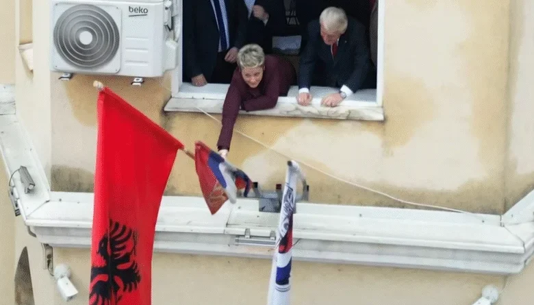 Në pamje shihet teksa ajo vendos flamurin kuq e zi në godinën e Komunës së Preshevës, një gjest simbolik që shënon festën kombëtare shqiptare.
