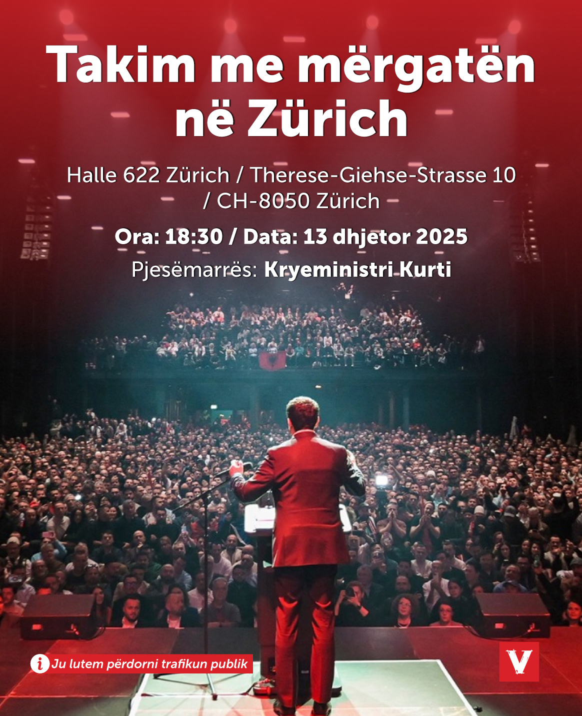 Lëvizja Vetëvendosje! njofton se Kryeministri i Republikës së Kosovës, Albin Kurti, këtë të shtunë më 13 dhjetor 2025, do të qëndrojë në Zürich, ku do të zhvillojë një takim të hapur me mërgatën shqiptare, njofton albazone media.