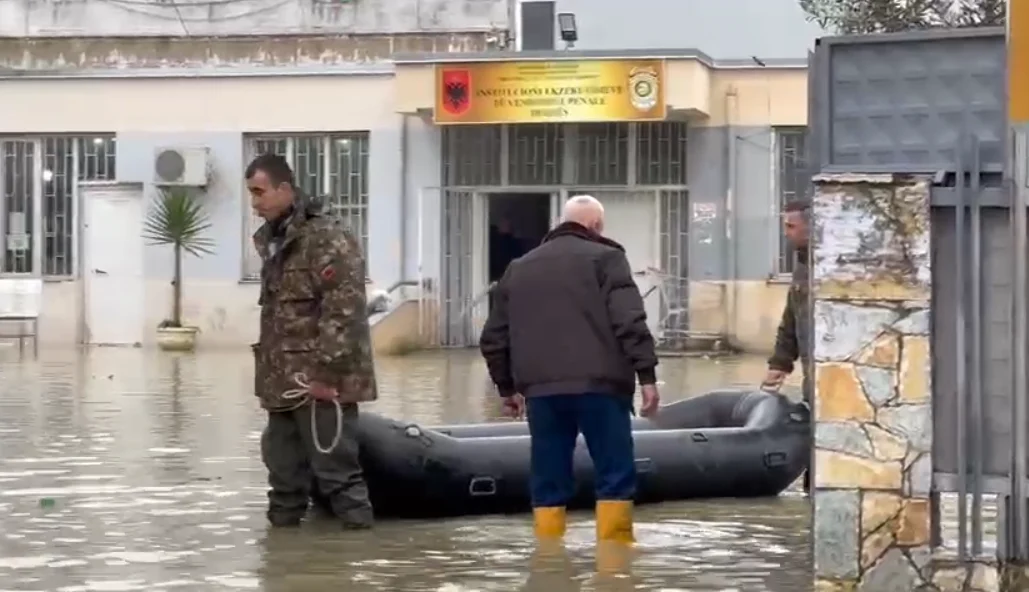 Sikurse duket nga videoja e siguruar nga Top Channel, në oborrin e burgut është edhe një gomone, pasi ka vërshim të lartë të ujit.