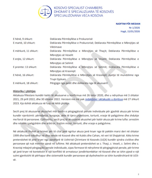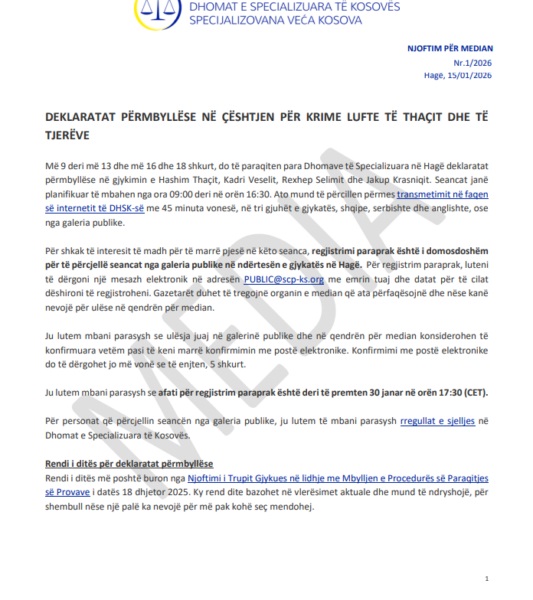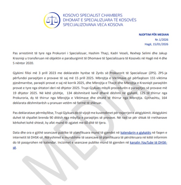 Në njoftim, Dhomat e Specalizuara, bëjnë të ditur se nga data 9 deri më 13 shkurt, si dhe më 16 dhe 18 shkurt, në Hagë do të zhvillohen deklaratat përmbyllëse në gjykimin ndaj Hashim Thaçit, Kadri Veselit, Rexhep Selimit dhe Jakup Krasniqit.
