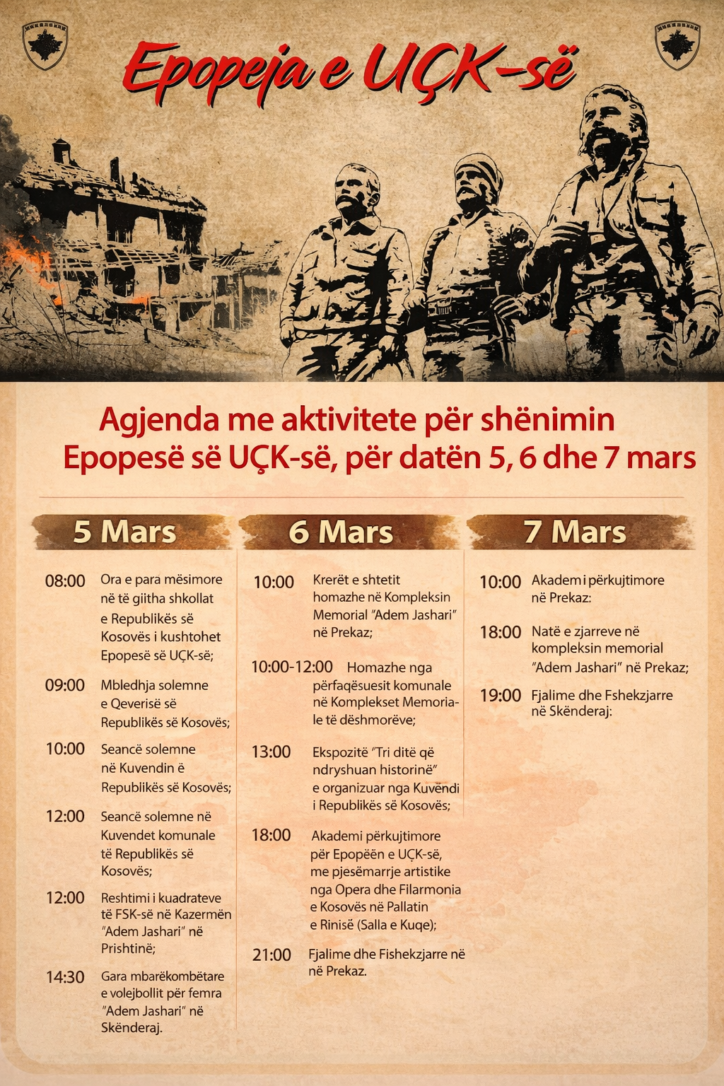 Institucionet e Republikës së Kosovës kanë publikuar agjendën zyrtare të aktiviteteve për shënimin e Epopesë së UÇK-së, që do të zhvillohen më 5, 6 dhe 7 mars në disa qytete të vendit.
