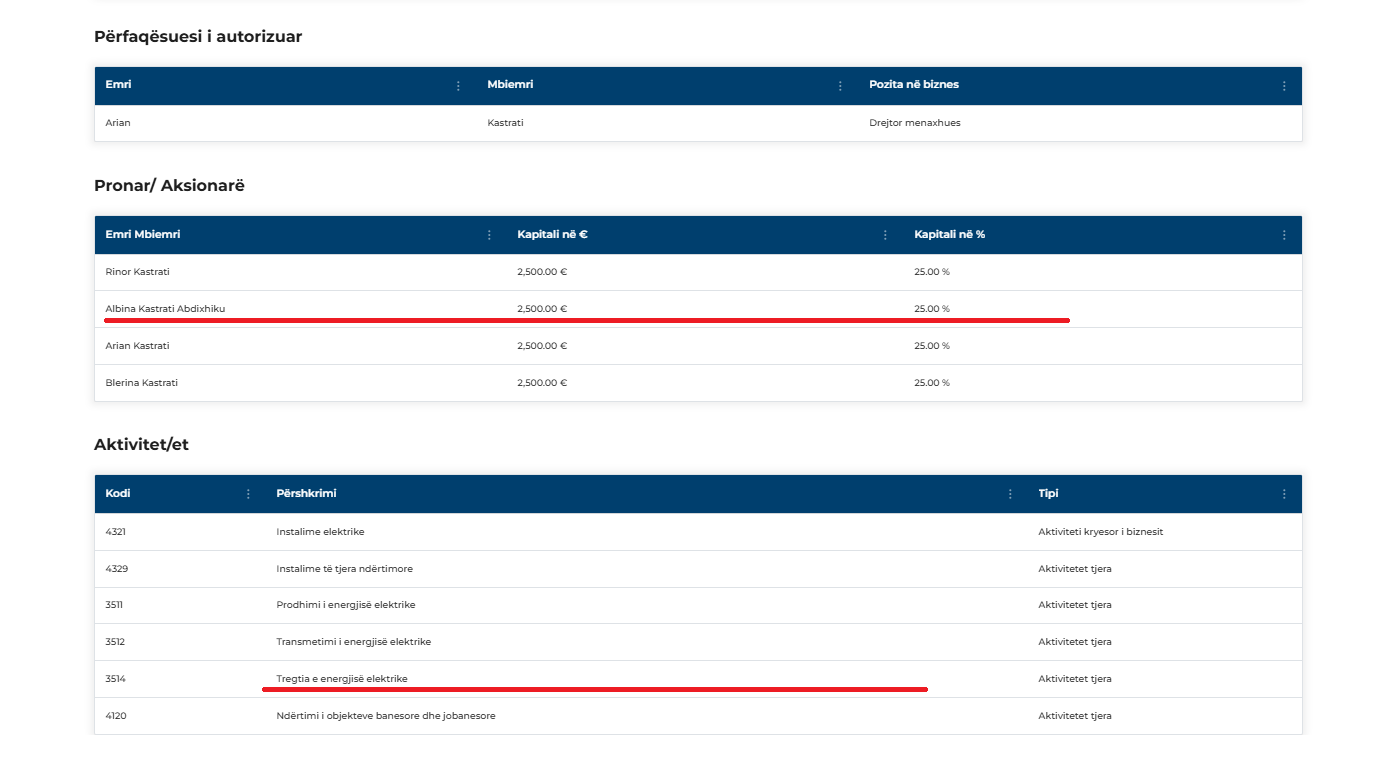 Në të dhënat zyrtare rezulton se Albina Kastrati-Abdixhiku zotëron 25 për qind të aksioneve në këtë kompani.