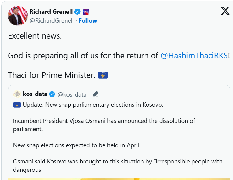Në një postim në rrjetin social X, Grenell shkroi: “Lajm i shkëlqyer. Zoti po na përgatit të gjithëve për rikthimin e Hashim Thaçit! Thaçi për kryeministër”.