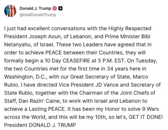 “Unë i kam udhëzuar Zëvendëspresidentin JD Vance dhe Sekretarin e Shtetit Rubio, së bashku me Kryetarin e Shtabit të Përbashkët, Dan Razin’ Caine, të punojnë me Izraelin dhe Libanin për të arritur një PAQE të Qëndrueshme.