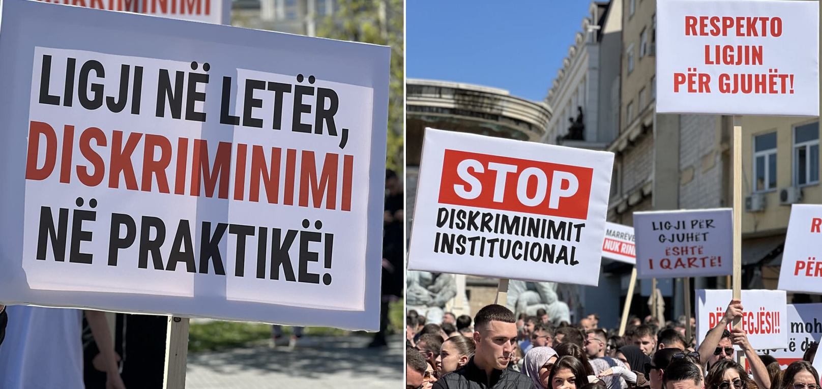 “Ligji në letër, diskriminim në praktikë”, shkruhet në një njërën prej pankartave, teksa një numër i madh kanë marrë pjesë.
